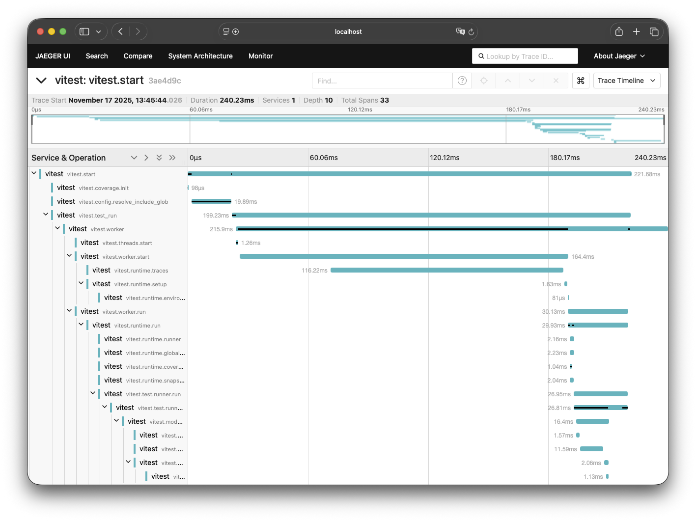 OpenTelemetry 初始化会增加每个测试的启动时间,除非 Vitest 在没有 隔离 的情况下运行。你可以在 vitest.worker.start 内部看到它作为 vitest.runtime.traces 跨度。